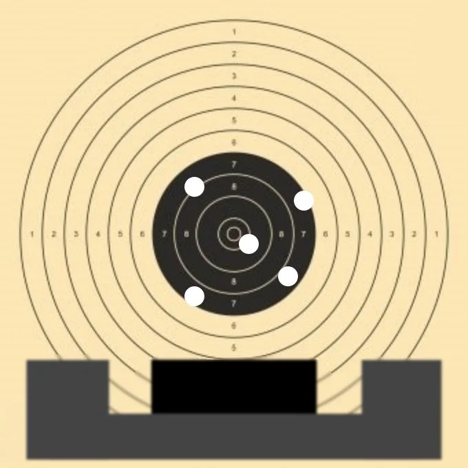 Trotzdem gibt es Schützen, die die gesamte Pistole in der Längsachse neigen und somit "verkanten". Das Trefferbild liegt beim nach links verkanten leicht links und unterhalb der Zehn, beim rechts verkanten leicht rechts unten.